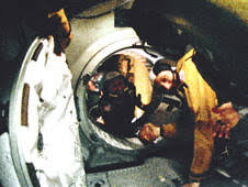 The actual transfer process, this is the first of four during the 44 hours we will be docked, takes about a half hour. Deke works through the steps to open the hatch, which Leonov equalized pressure with the Docking Module and opens his hatch. A tunnel, about 2-ft. long, is created between the hatches where the vehicles are joined.