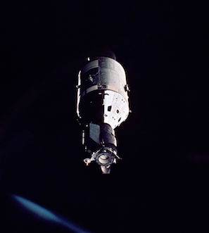 ` Full circle: Our flight now mirroring that of the first Apollo flowing on an earth orbital mission in 1968, Apollo 7. However, we are busier than the Apollo 7 crew was during the last half of their mission. The day after bidding Soyuz farewell, we are so busy with crystal-growth experiments in the multipurpose furnace in the Docking Module, and earth-observation photography, contorting ourselves to get good views out Apollo’s windows, we barely have time to squeeze in lunch.