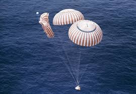 A minute after they deploy, at 10,000 ft., the three big main parachutes blossomed. “The mains are out.” Everything perfectly on track for splashdown within 10 mi. of the prime recovery carrier, USS Okinawa, 328 mi. north of Hawaii. We see three good chutes. At 8,000 ft., we dump the remainder of our thruster propellant.
