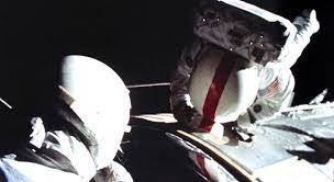 . . . But T.K. — his luck hasn’t improved. There goes his wedding ring on a spacewalk of its own — into eternity. It floats right at him, tumbling as it goes. Hits him in the back of his helmet. And instead of ricochetting into infinity, rebounds right back to the open hatch. What are the odds? Charlie grabs it.