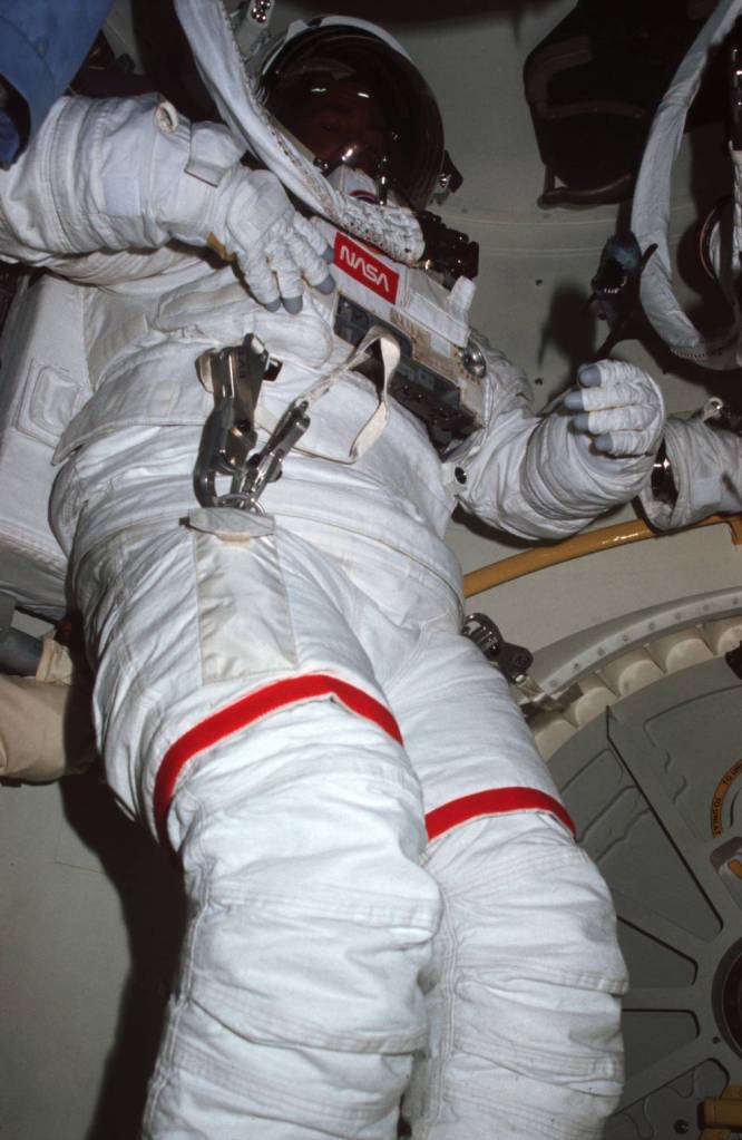Up at 1 a.m. (EST) on the 15th, we’re feeling fine. Two hours later, we begin preparing for the EVA. Lenoir and Joe Allen enter the cylindrical airlock at the rear of the middeck and don the two-piece spacesuits consisting of a hard upper torso and soft lower half. They check out the systems, and prepare to begin a 3.5-hr. “pre-breath” of pure oxygen to rid their bodies of nitrogen that could, at the lower suit pressure, cause what divers call “the bends.”