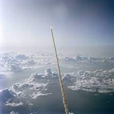 June 18, 1983: Challenger rides a thin column of solid exhaust above the clouds.