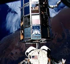 We back away, and watch it against the cloudy blue Earth. And turn our attention to the main event, Solar Max. We are in a lower orbit than the satellite and trailing it. Objects in a lower orbit gain on those in higher orbits. We’re presently gaining 60 mi. on it on each orbit. Closing in as we sleep to set up tomorrow’s rendezvous and first spacewalk.