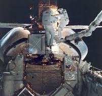 At 4:19 a.m., the hatch is open and out the pair swim. “Looks a lot better out here with the satellite sitting here.” Sure does! — the satellite held vertically on a support cradle at the rear of the payload bay, just waiting for us.