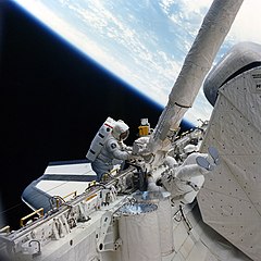 At about 7:30 a.m., on the nightside of orbit, Jeff exits the airlock. “My goodness, it’s dark outside,” he says. The duo quickly gathers the items we need from tool boxes and make our way to the robot arm. Rhea, the arm operator, has positioned it handing down over the right-hand side of the bay, half way back the length of the 60-ft. bay. Since none of this was planned, they have no task-specific tools, such as foot restraints to anchor themselves. They have to float free, holding on to the sill of the payload bay or the robot arm as they wrap the “PRD” straps around the cylindrical end of the robot arm. They attach the fly swatter first, and pause to exclaim, “Oh, there’s the moon! Oh, there’s the horizon! The sun is getting ready to come up.”